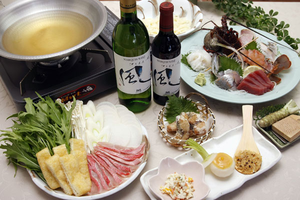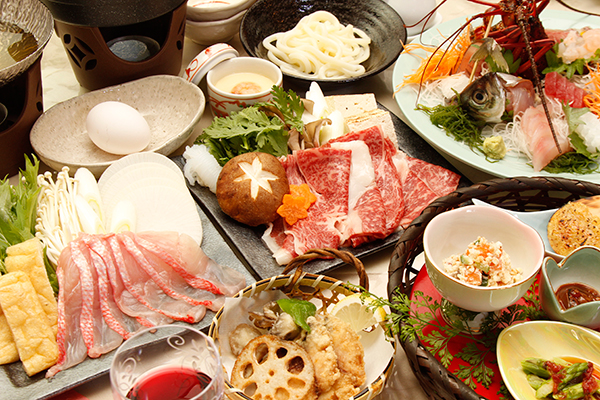 (金目鯛のしゃぶしゃぶと伊豆牛のすきやきを1人前ずつお出しします。お二人でシェアしてお召し上がりください。伊勢海老はお二人様で一尾となります)